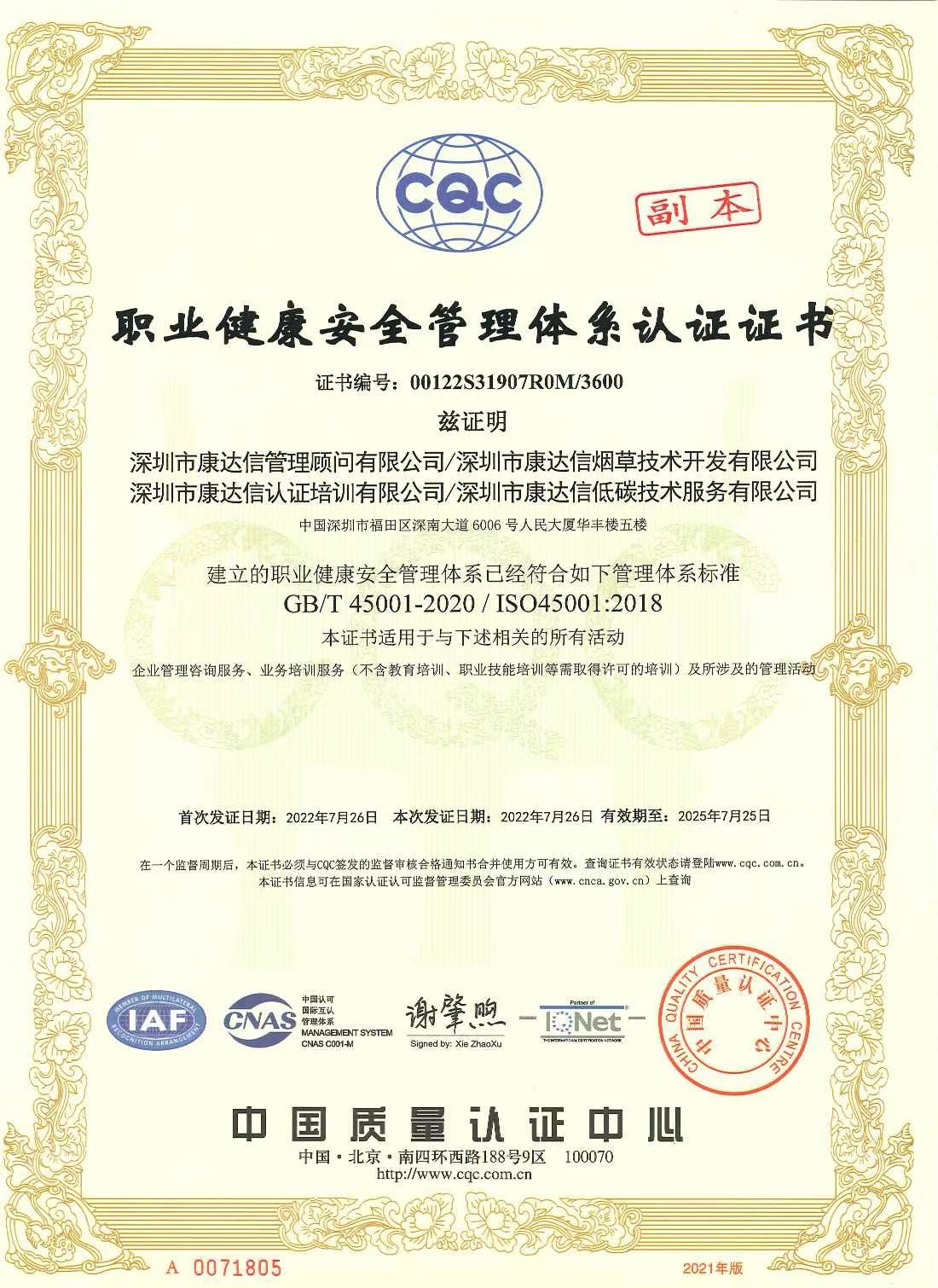 2022年7月,中國質量認證中心的審核專家根據(jù)ISO9001質量管理體系、ISO24001環(huán)境管理體系和ISO45001職業(yè)健康安全管理體系標準對我司“三標”管理體系進行了為期二天的審核,審核組一致認為我司已經(jīng)建立起成熟的自我監(jiān)測和改進的內部機制,符合認證標準。7月28日正式獲得質量、環(huán)境、職業(yè)健康安全管理體系認證證書。