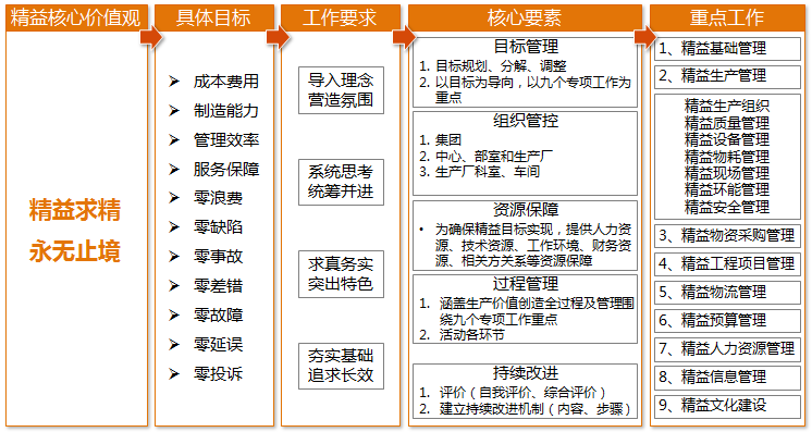 5. 盡善盡美:精益生產(chǎn)的目標是通過盡善盡美的價值創(chuàng)造過程為用戶提供盡善盡美的價值。盡善盡美是難以達到的,但對盡善盡美的持續(xù)追求,將造就一個永遠充滿活力、不斷進步的企業(yè)。